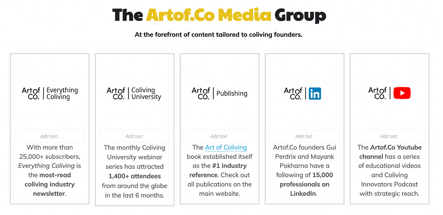 Our goal is to create strong and long term brand awareness for your company, which educates coliving actors on how your solution can benefit them. Our content is value-driven. We only promoted products and service providers that our community wants and needs. By working with Artof.Co and its media channels, you align your brand with the forefront of living space innovation and a dedicated community of professionals, enthusiasts, and pioneers in the coliving sector.